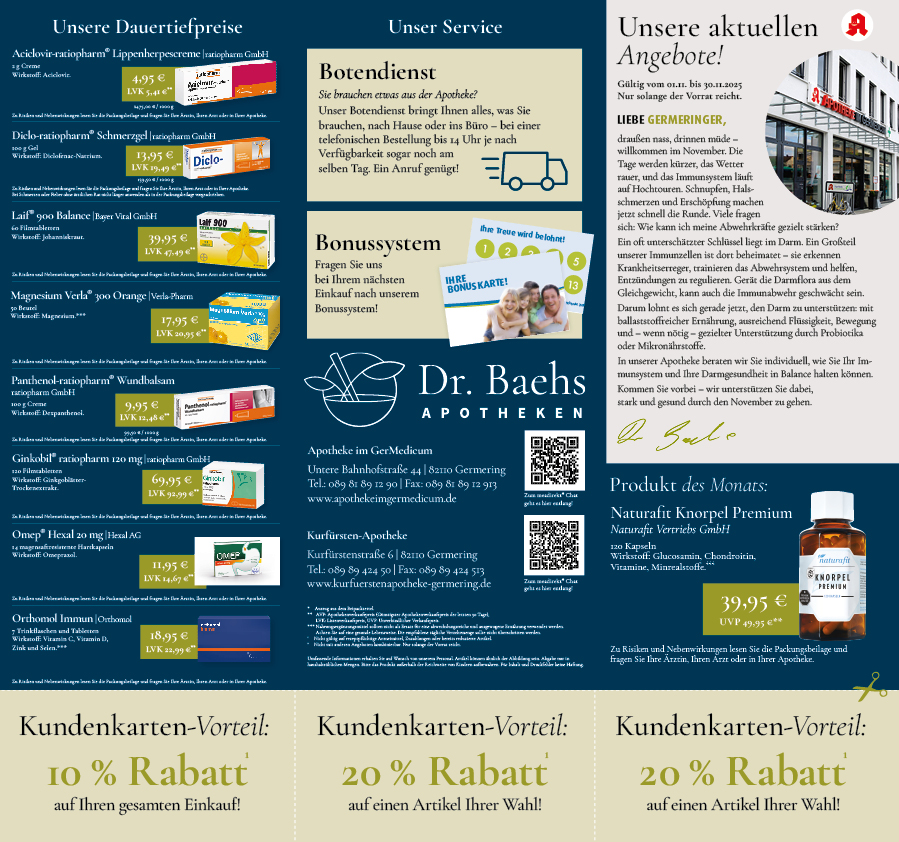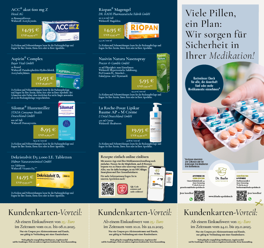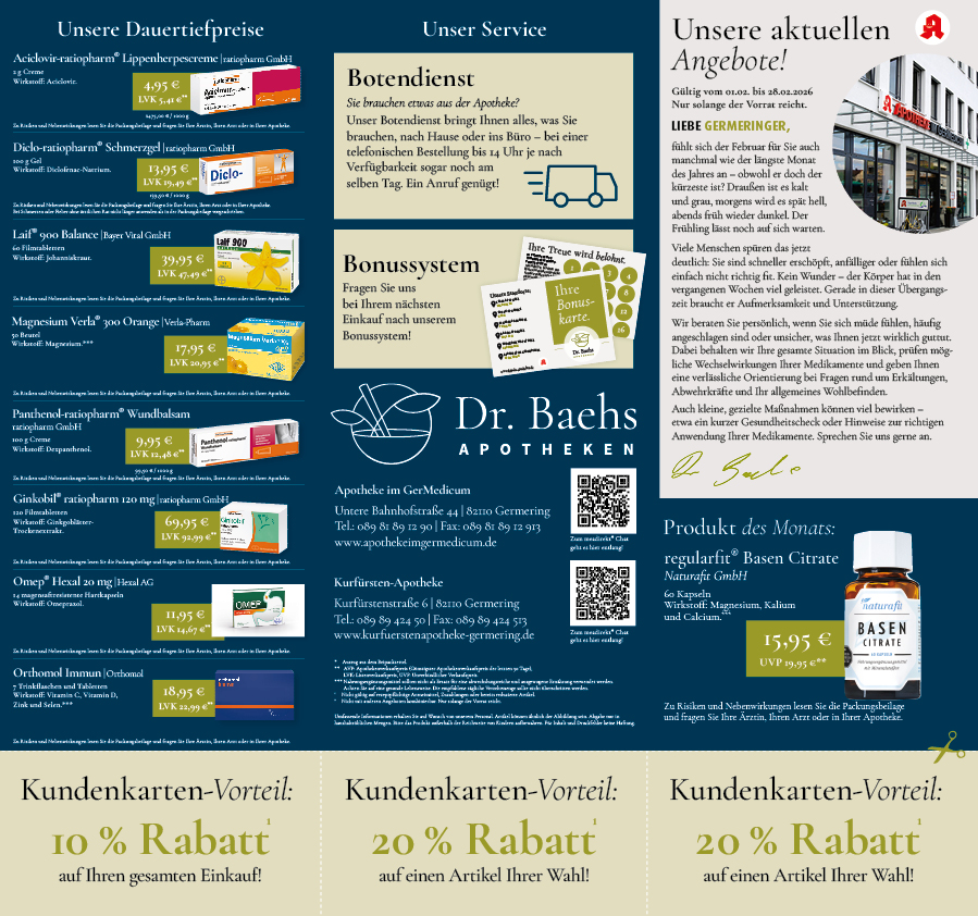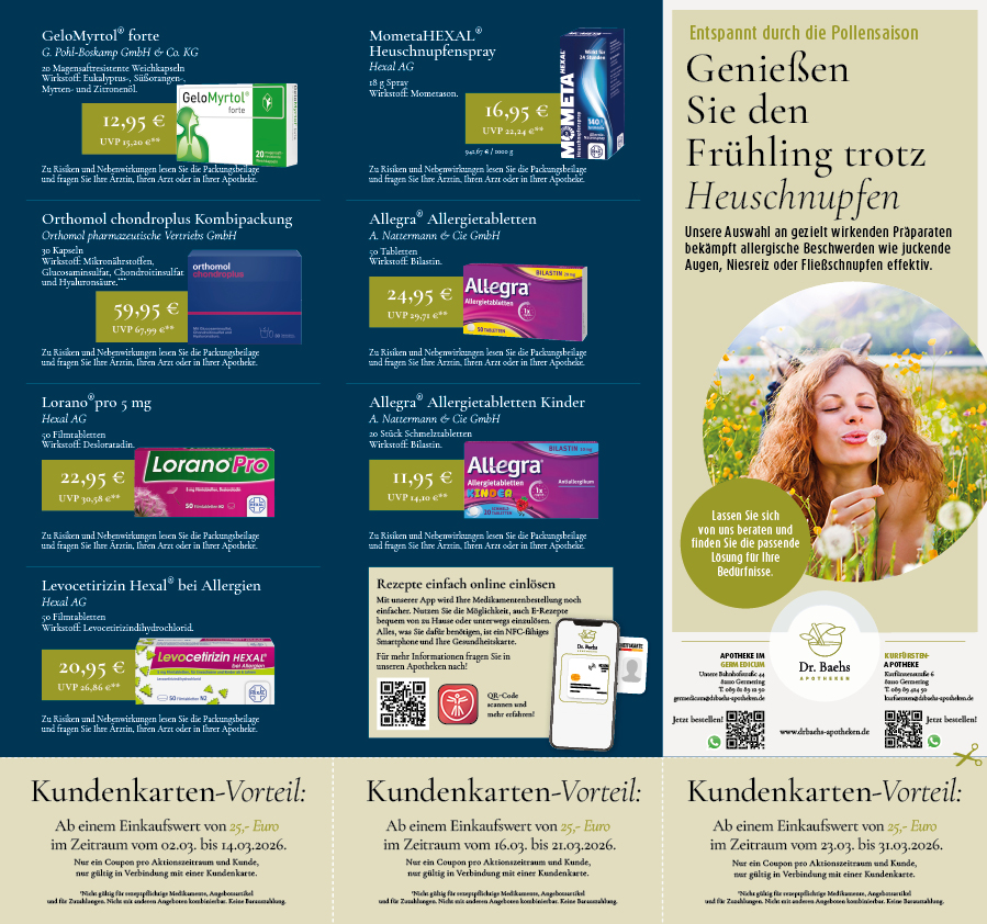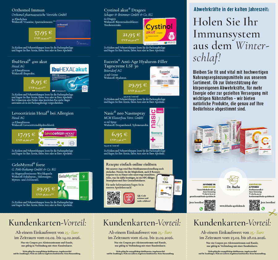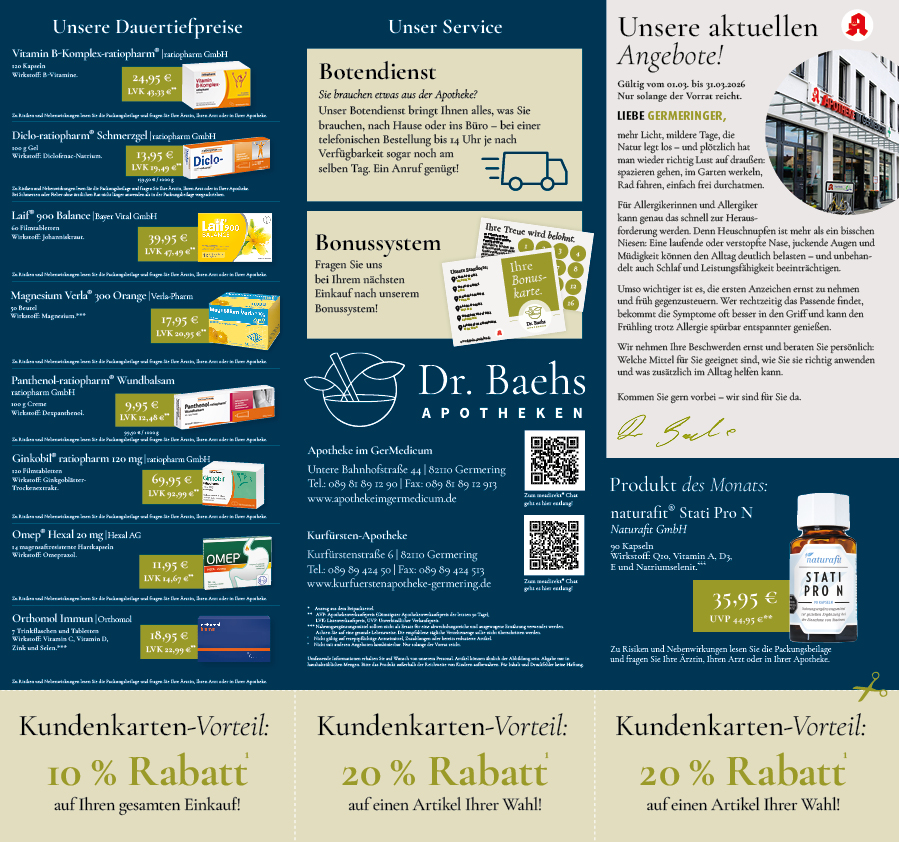 * Auszug aus dem Beipackzettel. ** Vorheriger Verkaufspreis in unserer Apotheke. *** Nahrungsergänzungsmittel sollten nicht als Ersatz für eine abwechslungsreiche und ausgewogene Ernährung verwendet werden. Achten Sie auf eine gesunde Lebensweise. Die empfohlene tägliche Verzehrmenge sollte nicht überschritten werden. Bitte das Produkt außerhalb der Reichweite von Kindern aufbewahren. Umfassende Informationen erhalten Sie auf Wunsch von unserem Personal. Zu Risiken und Nebenwirkungen lesen Sie die Packungsbeilage und fragen Sie Ihre Ärztin, Ihren Arzt oder in Ihrer Apotheke. Artikel können ähnlich der Abbildung sein. Abgabe nur in haushaltsüblichen Mengen. Für Inhalt und Druckfehler keine Haftung.